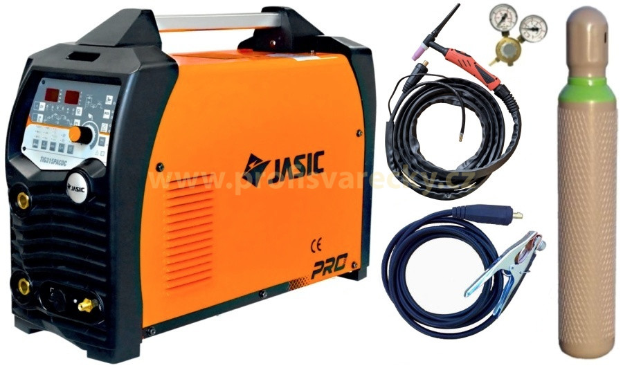 Set Jasic TIG 315P AC/DC E202 + hořák SR 26/4 m + zemnicí kabel 3 m + tlaková láhev argon 8L/200 bar naplněná + redukční ventil argon 2 manometry.