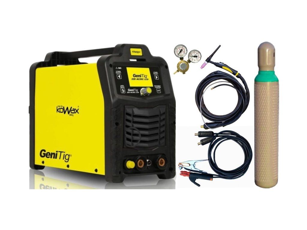 Kowax GeniTig 220 AC/DC LCD + hořák TIG + sv. kabely tl. láhev s argonem + red. ventil