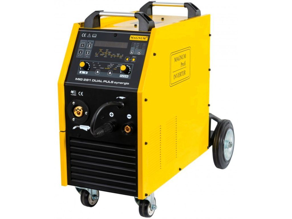 Magnum MIG 281 Dual Puls Synergi je multifunkční svařovací stroj s vynikajícími svařovacími vlastnostmi, vysokým výkonem a účinností, vybavený dvojitým pulsem a synergickým ovládáním pro svařování s minimálním rozstřikem. Svářečka má programy pro ocel, nerez, hliníkové slitiny AlSi a AlMg, CU a pájení pozinkovaných plechů. Pro tenké hliníkové plechy je vybavena funkcí ATC pro snížení tepla. Dále je možno použít funkci pro úpravu parametrů a tovární nastavení. Režimy pro spínání jsou 2-takt, 4-takt, speciální 4-takt pro hliník a bodování. U speciálního 4-taktu je možno nastavit HOT-start a dovaření kráteru. Všechny parametry se zobrazují přehledně na 2 displejích v kombinaci s LED kontrolkami parametrů a funkcí. Podavač je robustní 4-kladkový s náhonem na všechny kladky. Stroj má také možnost svařování obalenou elektrodou - MMA.