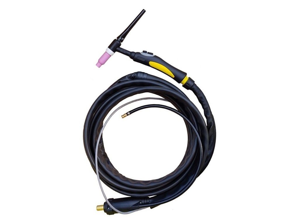 Kvalitní hořák TIG modulární konstrukce s ergonomickou rukojetí s kloubem a koženou částí ochranného návleku v místě největšího namáhání za rukojetí. Vzhledem k dobře promyšlenému tvaru rukojeti hořák dobře padne do ruky. Pomocí dvojtlačítka up/down v rukojeti hořáku je možné dáklově ovládat proud svářečky.